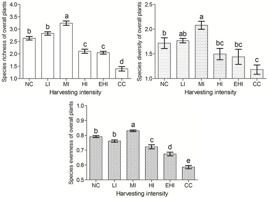 According to the results of multiple comparisons (Figure 2), the species richness, diversity, and evenness of overall plants were not significantly different after selective harvesting at low intensity. These parameters significantly increased after selective harvesting at medium intensity. The species richness and evenness of overall plants significantly decreased after selective harvesting at high and extra-high intensities. The species richness, diversity, and evenness of overall plants significantly decreased after clear-cut harvesting.