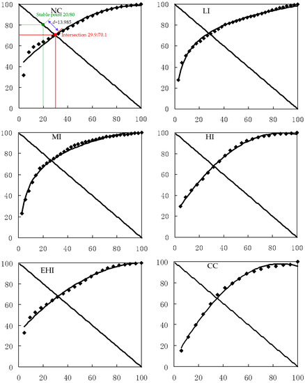 The stability test method of Godron M. was discovered by the French ecologists from industrial production and introduced into plant ecology [44]. After this method was introduced into China, it was improved by Zheng (2000) and has been confirmed to be reliable in previous studies of community stability [45]. This method considers the relative frequency of a community in a variety of plants and the stability of the relationship between the plants species as a decision basis [45]. The species number and individuals reflected to a certain extent the characteristics of a community, and reflected the stage of development and the degree of community stability. The frequency of different species is conversed into relative frequency, is accumulated according to the cumulative from big to small order together, and then, a smooth curve and fuzzy model is set. At last, the coordinate of the crossing point is determined by the curve and linear aspect (y = 100 − x). According to the stability test method of improved Godron M., the stability point of a community is 20/80 [44,45]. That is to say when the accumulative inverse of the species number reached 20% and the accumulative relative frequency of these species reached exactly 80%, the plant community was considered a stable community. The gap between the point of the intersection and the point of stability was measured by the Euclidean distance (d), so as to judge the degree of proximity of the actual community and the stable community. The farther the Euclidean distance, the less stable the community.