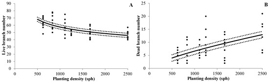 As shown in Table 3, numbers of live (NLB) and dead (NDB) branches were significantly correlated with planting density (PD). In our fitted models, PD was also the only predictive variable for the models of NLB and NDB (Equations (3) and (4)). The equations are as follows: