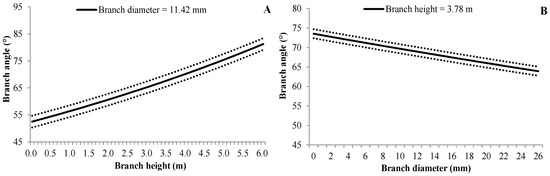 Simulated plots (solid lines) based on marginal model (Equation (7)) for predicting branch angle with 95% confidence intervals (dashed lines). (A) Predicted branch angle versus branch height based on mean branch diameter; and (B) predicted branch angle versus branch diameter based on mean branch angle.