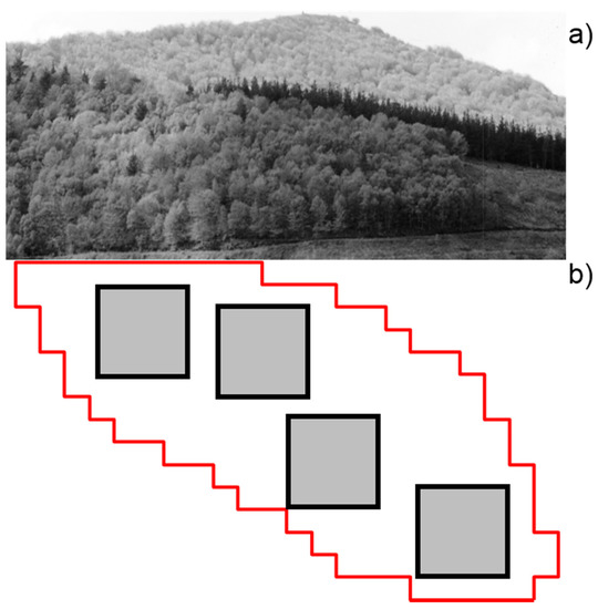 (a) View of the study area in northern Spain. (b) Experimental design with the spatial distribution of the four sampled 40 m × 40 m plots (6400 m2).