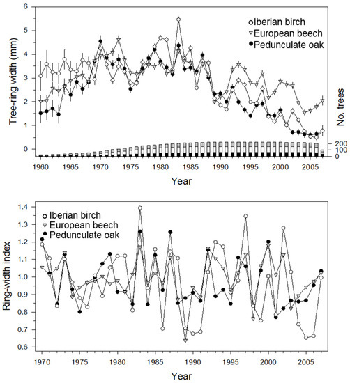 Overall, 228 trees were sampled (95 Iberian birches, 70 European beeches, and 63 pedunculate oaks). Average tree DBH and height did not differ among tree species, although there was a large variability in DBH within each species (Table 1). Radial growth was high (3 mm year−1) for all species until 1989, when a decreasing trend started (Figure 2, upper plot). Decline was severe for pedunculate oak and Iberian birch, leading to growth rates lower than 0.5 mm year−1, but moderate for European beech (2 mm year−1).