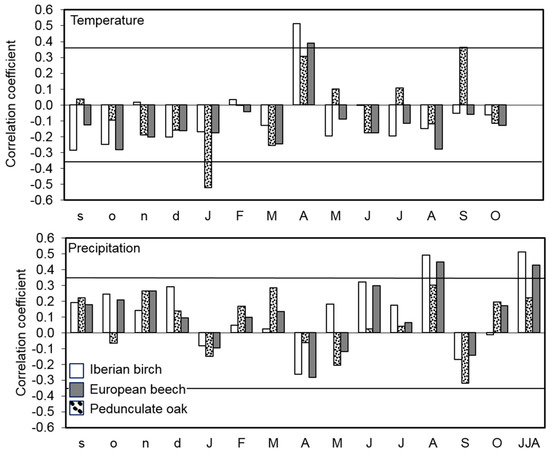 Pearson correlations were used to identify the main climate parameters constraining secondary growth in the three species. The selected climatic factors were monthly precipitation, hailstorm and mean temperature, as well as summer (June–August) precipitation, since this period is critical for secondary growth in the study area. Temperature and precipitation data were obtained from the nearest meteorological station covering the study period (1977–2007), namely the Eibar station located 26 km away from the study site (43°11′07″ N, 2°28′15″ W, 121 m a.s.l.). Hail data were obtained from the Igeldo station located 59 km away (43°18′23″ N, 2°02′28″ W, 251 m a.s.l.), since this variable requires a permanent observation, and Igeldo fulfils that criterion. A time window from September, prior to the ring formation, to October from the year of growth, was used for temperature and precipitation correlations. For hail, the time window spanned from the previous December to the current April, as winter hail during this period is associated with large-scale cold fronts [46], and thus, meteorological data were reliable, in spite of the geographic distance. Significant climatic variables (p < 0.05) for each species were selected.
