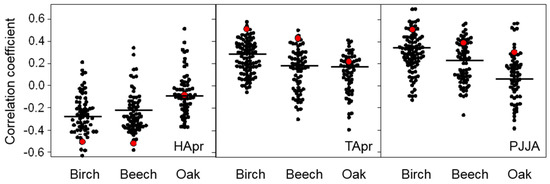 Individual tree climate–growth correlation coefficients calculated for the three tree species and considering selected significant climatic variables. Significant climatic variables: April hail (HApr) and mean temperature (TApr), and summer precipitation (PJJA, June-July-August precipitation). The red dots represent the species climate–growth correlations, the black dots show individual climate–growth correlations, and the horizontal lines indicate the medians of individual correlations.