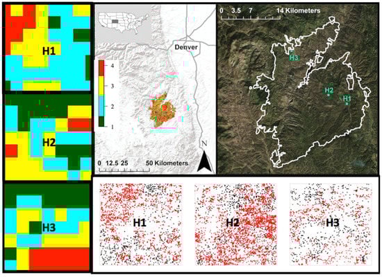 The Hayman Fire and plot (H1, H2, and H3) locations in the Colorado Front Range, USA. Within each plot, residual trees (black points) are shown relative to post-fire regeneration (red points) (bottom row). Esri basemap layers: the World Terrain Reference shows the Hayman Fire in relation to Denver and World Imagery denotes topography and forest cover in relation to plot locations within the fire. Monitoring trends in Burn Severity (MTBS) shows the mixed-severity fire effect in the Hayman Fire. Thematic burn severity classes include unchanged (green), low- (cyan), moderate- (yellow), and high- (red) severity (left side; scale is 4 ha).
