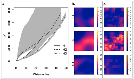 (a) Post-fire regeneration density in relation to the Neyman–Scott point process model for plots (H1, H2, and H3) in the Hayman Fire. Observed data (black lines) were within the bounds of the simulated envelope for the Neyman–Scott model (shaded region), confirming that the data were spatially clumped at all distances. Comparing (b) observed and (c) predicted densities shows that the model is capturing general trends in regeneration density.