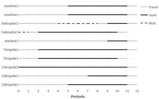 Running the model on our single fire test case, we obtain the fact that ten resources are selected to work to contain the fire (Figure 1). Helicopter1 and 12brigade3 continue to work to contain the fire, with the situation of the helicopter1 being particular because it is currently in a rest period. By contrast, airplane2 (no airplane2 is shown in Figure 1) finishes its work to contain the fire because it is longer favorable to incorporate a new resource.