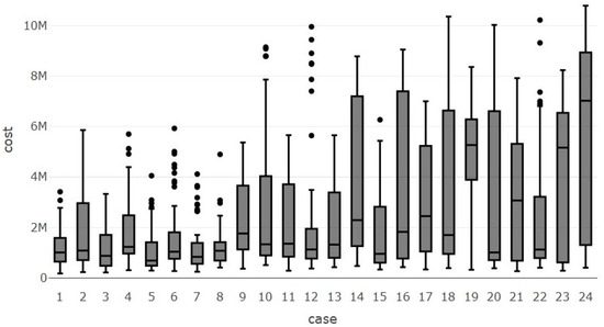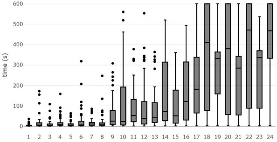 We can see also that the smaller the number of periods, the shorter the runtime will be (Figure 3). Specifically, if the number of time periods is less than 30 (equivalent to 300 min), the execution times are small with all the instances being resolved in less than 10 min. If we analyze the execution times presented, it can be clearly observed that both the median and the variance for the execution time increases with a greater number of periods. To achieve consistently short executions times, we recommend performing executions with approximately 20 time periods (a time horizon of 3 h and 20 min).