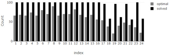 When we analyze the percentage of solved instances for each case (Figure 4), first we consider the percentage of instances that were resolved optimally with the first model. If the solver returned an infeasible or time_limit while executing the first model, the second model was used. We use the term optimal because, in the instances resolved with the first model, the fire can be extinguished in the period considered. We also consider the percentage of instances that were solved either with the first model or with the second. Remember that the second model is used when the fire cannot be extinguished with the resources available in the period considered, so we limit ourselves to maximizing the performance of the resources. The model will have to be executed again until the fire is extinguished. If, in the second model, an instance was not resolved within the desired time, then it was considered that the model was not solved, and therefore the black bar does not reach 100%.