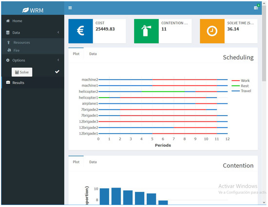 The interface allows for simple interactions to load information on the resources as well as the evolution of the fire and aviation and brigade regulations. It also offers an option to run the model. Once the execution is complete, a visualization of the results is shown both graphically, which includes interactive graphics employing the plotly library [32], and in tabular format. It is possible to create HTML reports to save important information on the executed instance.