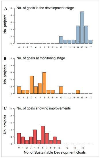 Figure 4 visualizes the marked gap between the number of SDGs identified at the design stage, relative to the various stages of implementation that REDD+ projects have reached. While most REDD+ projects presented plans in line with 14 out of 17 of the SDGs, most only evidence improvement against five of the Goals. The Figure shows the performance of each project with respect to its stated objectives based on evidence provided at project verification. There was a marked gap seen between each projects’ SDG-related aspirations, their identification of monitoring variables, and evidencing ‘improvement’ in these fields. On average, projects were evidencing improvement against 34% of their initial objectives—meaning that two-thirds of their initial SDG-related activities were either being monitored, but not yet demonstrating improvement, or that monitoring variables had not been identified at all (approximately one third each). Some projects demonstrated improvement across a large proportion of their originally identified SDG-variables (Figure A1). Projects 11 and 12 reported improvements towards 64% and 70% of the Goals that they initially identified, respectively. Figure A1 makes apparent that these projects are targeting slightly fewer goals (14 and 10 out of 17 respectively), but they appear to be doing so more efficaciously, and with a specific concern for systematic and verifiable indicators that allow progress to be monitored.