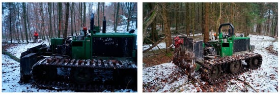 In the federal state of Baden-Württemberg (BW) located in Southwestern Germany, the state forestry department (Forst BW) supports the reduction of extensive off-road traffic, and therefore, a distance of at least 40 m between parallel skid trails is promoted for areas with sensitive soils or inclinations above 30% [5]. In addition to reducing disturbed areas, such a distance between the skid trails is also in accordance to the German Forest Stewardship Council (FSC)-certification standard 3.0 [6]. In FSC-certified forests, no more than 10% of the area of managed forests should be used as skid trails, a criterion that is met by setting the distance between parallel skid trails to at least 40 m. This may have led to increased skid trail intervals also in private-owned forests. A survey on forest operations in Southwestern BW showed that the distance between skid trails was 40 m, in 83% of the recorded felling operations regardless of the forest ownership [7]. These conditions often lead to motor-manual felling and mechanized winching operations. Remote-controlled mini forestry crawlers (MFCs) (Figure 1) might be a suitable option to support sustainable forest operations.