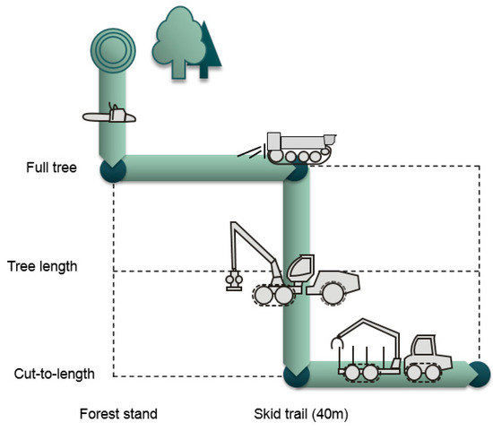 A two-person team felled the trees motor-manually then winched the whole trees to the skid trails using the MFC. Motor-manual felling was done using a chainsaw (i) for the trees beyond the boom reach of the harvester, (ii) for the trees with DBH that exceeded the maximum felling diameter of the harvester head, and (iii) for the broadleaved trees with widespread crown and thick branches which could cause problems during the harvester processing. During winching, the logs were moved from the felling site to the skid trails, where the harvester could process them except for trees with widespread crown and thick branches, which were processed motor manually. Each task was entrusted to one experienced worker: one felled the trees using the chainsaw, while the second operated the MFC. Although the overall production system included both workers as they worked as a pair, the time consumption was recorded for the MFC operator only. After the trees were winched, a harvester felled and processed the trees within the boom reach and processed the bunched trees. Finally, the extraction was done by a forwarder. The wood harvesting system according to the German Center for Forest Work and Technology (KWF) [19] is shown in Figure 2. Besides winching, the MFC was also used to assist with pulling hung-up trees during the felling.