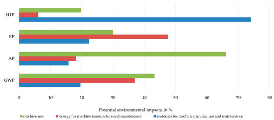 Potential environmental impacts in the categories human toxicity (HTP), eutrophication (EP), acidification (AP) and global warming (GWP), and divided in (i) maintenance and machine use (in green), (ii) energy consumption for machine manufacture (in red), and (iii) materials for machine manufacture and maintenance (in blue), in %.