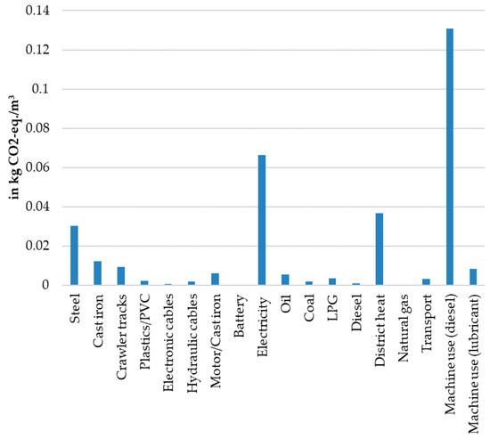 Potential environmental impacts in respected categories were evaluated at 0.321 kg CO2-eq./m3 in GWP100, 1.64 × 10−3 kg SO2-eq./m3 in AP, 6.31 × 10−4 kg PO4-eq./m3 in EP and 0.201 kg 1.4-DCB-eq./m3 in the HTP. Diesel consumption during machine use was the most impacting in both categories GWP (with 40.7%) and AP (with 61.8%), whereas in the HTP steel was the most impacting (64.4%) and in EP electricity (41.7%) (Figure 3).