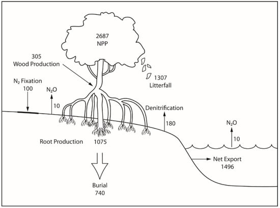 Nitrogen mass balance for the world’s mangrove ecosystems. Units are Gg N year−1. NPP = net primary production. The model assumes a global mangrove area of 152,000 km2 []. Data modified from Alongi [].