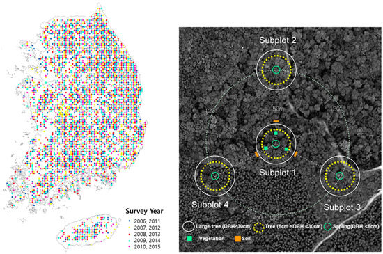 Permanent sample plots in the South Korean National Forest Inventory (NFI).