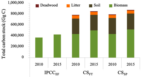 Total carbon stock in each approach. IPCCEF: Intergovernmental Panel on Climate Change (IPCC) default emission factors, CSFT: country-specific emission factors by forest type, CSSP: country-specific emission factors by species.
