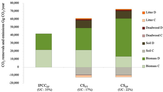 CO2 removals (+) and emissions (−), and their uncertainty (UC) in each approach. C: coniferous forest, D: deciduous forest, IPCCEF: Intergovernmental Panel on Climate Change (IPCC) default emission factors, CSFT: country-specific emission factors by forest type, CSSP: country-specific emission factors by species.