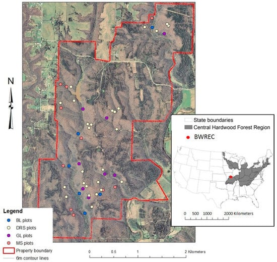 Location of vegetation sampling plots at Baskett Wildlife Research and Education Center (BWREC). Aerial image was taken in 2007. Plots shown by forest type: BL = Bottomland, DRS = Dry Ridge and Slope, GL = Glade-like, and MS = Mesic Slope. Inset shows the location of BWREC within the Central Hardwood Forest Region (map modified from []).