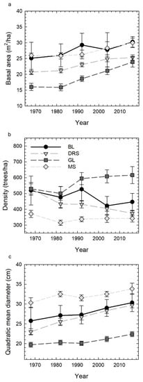 Stand structure through time for four forest types at BWREC, showing mean (±one standard error) for: (a) basal area (m2/ha), (b) density (trees/ha), and (c) quadratic mean diameter (cm). Forest types include bottomland (BL), dry ridge and slope (DRS), glade-like (GL), and mesic slope (MS).