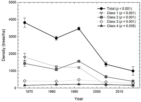 Midstory density (trees/ha; mean ± one standard error) through time for four size classes (Class 1 = 0–1.25 cm; Class 2 = 1.26–3.75 cm; Class 3 = 3.76–6.25 cm; Class 4 = 6.26–8.75 cm) and total (all midstory trees combined), pooled across four forest types at BWREC. The p-values indicate significance of change through time for each size class; pair-wise comparisons are not shown to increase legibility.
