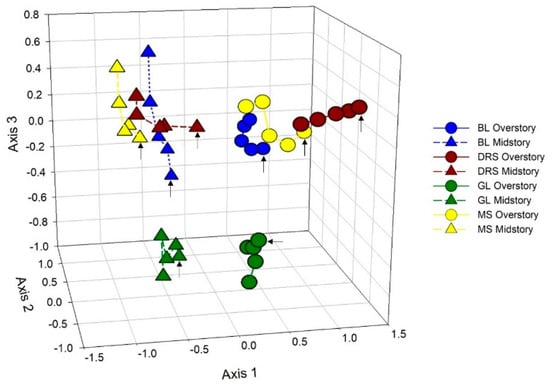 The BWREC study plots were previously categorized into four forest types based on tree species composition [,,]. In the current analysis, the forest types clustered in ordination space, and the species correlations with the axes helped to explain the ordination of forest types. For example, Axis 1 was positively correlated with white oak and negatively correlated with sugar maple, contributing to several observed patterns, including: the separation of the dry ridge and slope plots from the mesic slope plots; the shift towards the negative on Axis 1 through time for the dry ridge and slope and the mesic slope plots; and the separation of the overstory from the midstory layers within each of the forest types. Axis 3 was negatively correlated with species associated with glade-like habitats, including eastern redcedar, blue ash (Fraxinus quadrangulata Michx.), and chinkapin oak, whereas Axis 2 was positively associated with bottomland species such as Ohio buckeye, boxelder (Acer negundo L.), and hackberry (Celtis occidentalis L.).