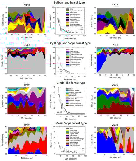 The bottomland forest type had the greatest number of species within the overstory. American sycamore (Platanus occidentalis L.) and American elm (Ulmus americana L.) were the most dominant species, with the greatest RD for each found at larger size classes in 2016 than in 1968 (Figure 5). Within smaller size classes (<20 cm DBH), Ohio buckeye (Aesculus glabra Willd.) had a notable increase in RD by 2016. In 1968, the dry ridge and slope forest type was clearly dominated by white oak across all size classes of the overstory. The greatest apparent change by 2016 was the increase in sugar maple in small size classes, with RD of sugar maple decreasing along the diameter distribution to approximately the 20 cm size class. An increase in the RD of sugar maple from 1968 to 2016 was also pronounced within small size classes of the mesic slope forest type. The mesic slope forest type was composed of primarily white oak and northern red oak in 1968, with these species dominating the larger size classes in 2016 (Figure 5). The glade-like forest type was dominated by chinkapin oak and Shumard oak (particularly in larger size classes) in 1968, with low RD of eastern redcedar. By 2016, the RD of Shumard oak had decreased, with an increase in RD of eastern redcedar in the smaller size classes (Figure 5).