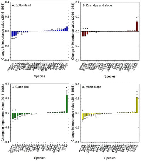 Change in importance value from 1968 to 2016 (mean and one standard error) for each overstory species in (A) bottomland, (B) dry ridge and slope, (C) glade-like, and (D) mesic slope forest types. Positive values are increase in importance value and negative values are decrease. ‘*’ indicates species for which change in importance value is significantly different from zero. Species abbreviations are defined in Table S1.