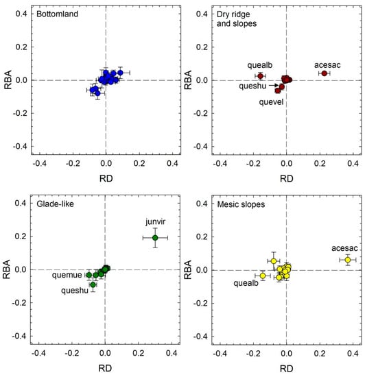 Change in relative density (RD; x-axis) and relative basal area (RBA; y-axis), each of which contribute to calculated importance value, from 1968 to 2016 for all overstory species occurring within each forest type. Species labels are provided only for species with significant changes in importance value from 1968 to 2016.