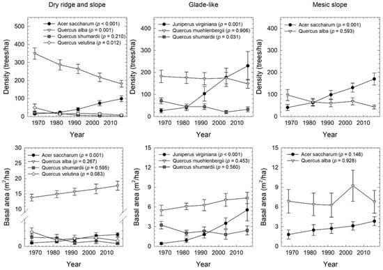 Changes in density (trees/ha) and basal area (m2/ha) through time for each overstory species that significantly changed in importance value from 1968 to 2016 for each forest type. The p-values indicate significance of change through time for each species; pair-wise comparisons are not shown to increase legibility.