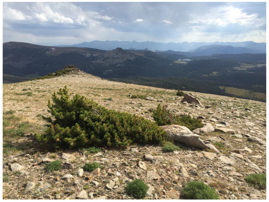 Conifer communities in temperate zone alpine-treeline ecotones—the transition between open subalpine forest and alpine tundra, hereafter, “treeline” [1]—provide important ecosystem services such as snow retention, soil stabilization [2,3], and wildlife habitat (e.g., [4]). Across the Rocky Mountains in locations not limited by geomorphology or topography, treeline community distribution and composition reflect the relationship between the physiological limits of constituent conifer species [5,6] and the harsh environmental conditions that characterize these ecotones, including extreme winds [7], cold and variable temperatures [8], moisture deficiency [9], and high solar radiation [10]. Community structure and composition at treeline have been assessed in many locations, and differences exist within and across regions, mainly in response to topographic and climatic variation, but also in response to subalpine species distribution, seed sources, site suitability, and snow deposition (e.g., [11,12,13,14]).