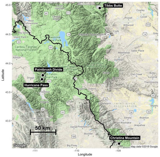 Study area geographic locations. The geographic location of study areas within the GYE. The black line traces the Continental Divide. Map courtesy of Google [44]. Figure created using the ggmap (version 2.6.1, Waco, TX, USA.) [45], ggplot2 (version 3.0.0, Houston, TX, USA.) [46], and ggrepel (version 0.8.0, Cambridge, MA, USA.) [47] packages in R (version 3.5.1, Vienna, Austria) [48].
