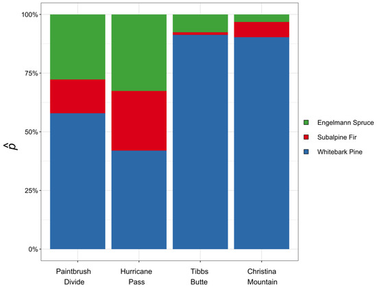 Species comprising the treeline communities at all four study areas included whitebark pine, Engelmann spruce, and subalpine fir; we observed no other conifer species at any location (Figure S1A). Our community composition analysis revealed that the relative abundance of whitebark pine was significantly greater than that of Engelmann spruce and subalpine fir at three of the four study areas: Paintbrush Divide, Tibbs Butte, and Christina Mountain (Table 3). At these locations, respectively, whitebark pine comprised 57.9% (95% CI: 43.8%, 70.3%), 91.3% (95% CI: 84.3%, 97.5%), and 90.3% (95% CI: 85.6%, 94.5%) of all conifers assessed (Table 4 and Figure 3). At the fourth study area, Hurricane Pass, we did not observe a majority conifer species.