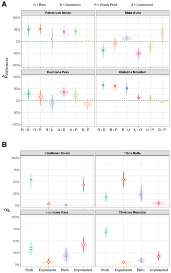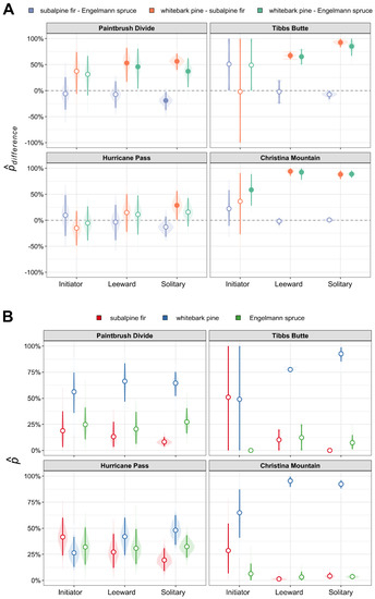 After calculating raw per-plot relative abundances, we derived pairwise mean-difference-in-relative-abundance variables for each assessment plot. To consider differences in species relative abundances, for example, we calculated the difference in per-plot relative abundance between whitebark pine and Engelmann spruce, whitebark pine and subalpine fir, and Engelmann spruce and subalpine fir. We repeated this general process for comparisons of tree island membership status (i.e., tree island, solitary), ecological role (i.e., initiator, leeward, solitary), nurse object type (i.e., rocks, micro-topographic depressions, woody plants, and unprotected), and white pine blister rust infection status (i.e., present, absent). We also determined per-plot differences in relative abundance between tree island initiators and solitary trees within species to test the association between solitary conifer relative availability and tree island initiation.