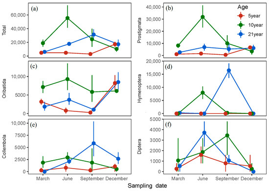 The effects of stand age and sampling date on the abundance (ind. m−2) of soil arthropods. Filled circles are bootstrapped means with 95% bootstrapped confidence intervals (error bars). Difference is statistically significant at α = 0.05 when 95% bootstrapped confidence intervals do not overlap other means. (a–f) stands for the abundance of Total, Prostigmata, Oribatida, Hymeoptera, Collembola and Diptera, respectively.