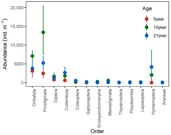 In the 5-year-old stands (Figure 2), Oribatida, Prostigmata, and Diptera comprised the most abundant groups, accounting for 85.7% of the total abundance, followed by Collembola, Coleoptera, and Siphonaptera, which together accounted for 11.6% of the total abundance. Less abundant groups included (in a decreasing order of abundance), Scolopendromorpha, Mesostigmata, Thysanoptera, Polydesmida, Lepidoptera, Hymeoptera, and Araneae. In contrast to the 5-year-old stands, the abundance levels of Prostigmata increased more than fivefold and twofold in the 10- and 21-year-old stands, respectively, and ranked highest among arthropod levels in the 10- and 21-year-old stands. Accordingly, the ranks of Oribatida transitioned to second and third from the top in the 10- and 21-year-old stands, respectively. The rank of Diptera was altered from third position in the 5-year-old stands, to fifth position in the 10- and 21-year-old stands. Hymenoptera emerged and ranked in third and second positions in the 10- and 21-year-old stands, respectively. The rank order of Collembola did not change in the three stand ages.