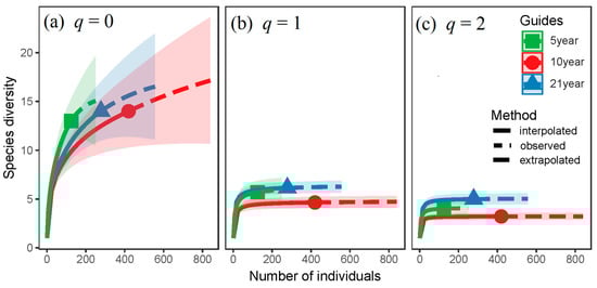 Sample size based rarefaction and extrapolation of soil arthropod diversity for Hill number (a) richness (q = 0), (b) Shannon diversity (q = 1), and (c) Simpson diversity (q = 2) with 95% bootstrapped confidence intervals (shaded areas).