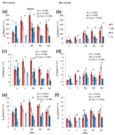 Leaf stomatal conductance (gs; (a,b)), transpiration (E; (c,d)), and light saturated net photosynthesis (Asat; (e,f)) of four species (Sp) at five sites (St) along an elevation gradient, measured during wet (a,c,e) and dry (b,d,f) seasons. Error bars show variation (SE) among trees within each species at each site (n = 6). P values for the effects of site (St), species (Sp), and their interaction (St × Sp) are shown in each graph. Significant overall differences among sites are indicated by different letters above the bars of each site. Explanations of site abbreviations are provided in Table 1; the order follows increasing elevation from left to right. Species abbreviations are based on first letters in genus and species: Pf = Polyscias fulva; Mk = Macaranga kilimandscharica; Sg = Syzygium guineense; Cg = Carapa grandiflora.