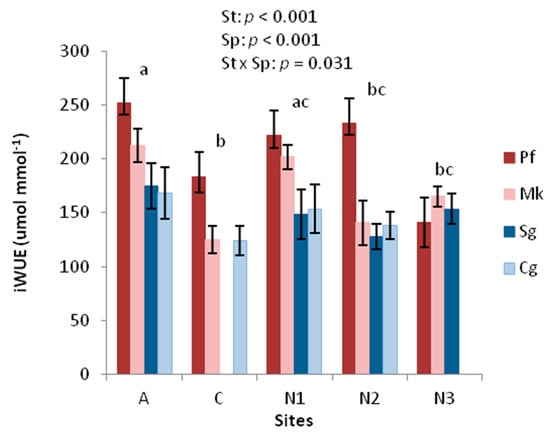 Intrinsic water use efficiency (iWUE = An/gs) from stable carbon isotope analysis of four species (Sp) at five sites (St) along an elevation gradient. Significant overall differences among sites are indicated by different letters above the bars of each site. Explanations of site abbreviations and species names are provided in Table 1 and Figure 1, respectively; the site order follows increasing elevation from left to right.