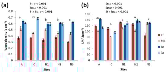 Leaf structural traits, wood density (a), and leaf mass per area (LMA; (b)) of four species (Sp) at five sites (St) along an elevation gradient. Significant overall differences among sites are indicated by different letters above the bars of each site. Explanations of site abbreviations and species names are provided in Table 1 and Figure 1, respectively; the site order follows increasing elevation from left to right.
