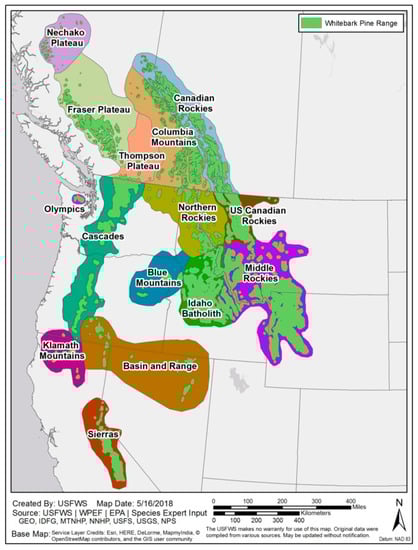 This report covers the entire range of whitebark pine in western North America, but it is difficult if not impossible to provide one set of detailed wildfire management actions that would be applicable everywhere. For the purposes of this report, the ecological zones map for whitebark pine developed by the US Fish and Wildlife Service was used to divide the area into different ecologically distinct regions (Figure 2). Differences in climate, soils, topography, and ecology are discussed in USFWS (Unitied States Fish and Wildlife Service) [21].
