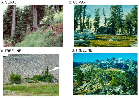 Sites where whitebark pine is the only major tree species able to successfully dominate high-elevation settings are called climax whitebark pine sites (CLIMAX) in this report and often occur on harsh sites in the upper subalpine forests and at treeline on relatively dry, cold slopes [23,25] (Figure 3b). Other species, such as subalpine fir, spruce, and lodgepole pine, can occur on these sites, but as scattered individuals with truncated growth forms [26] Alpine larch is often found on north-facing climax whitebark pine sites, often in association with sub-surface water [27]. Whitebark pine is mostly self-replacing in these open communities. These site types are often found in the Sierra, Kalamath, Cascades, and Basin and Range regions (Figure 2).