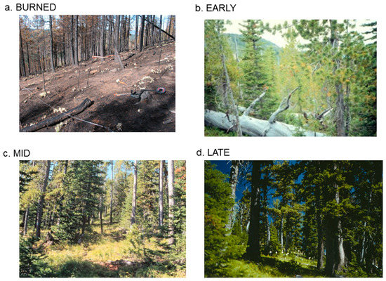 Four of the eight stand types used to stratify wildfire management actions. (a) recently burned stands, (b) early seral stands, (c) mid-seral stands, and (d) late seral stands that contain significant fir, spruce, mountain hemlock.