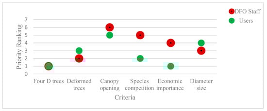Priority ranking of DFO staff and users in selecting trees for harvesting. Source: Users and DFO officials of Kankali CFUG, Chitwan (2017).