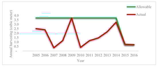 Allowable annual harvest and actual annual harvest in m3/ha (2005–2016). Source: Data collected from two consecutive FMPs and CFUG records.