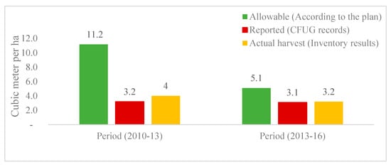 Overall, it was found that the actual harvest (from inventory results) in the CF is higher than the reported harvest (CF records), (see Figure 4), but in recent periods the allowable harvest (prescribed in FMP) almost matches the actual harvest. This is mainly because of strict monitoring and supervision of harvesting decisions by forest bureaucrats. Moreover, forest bureaucrats had introduced different thumb rules, such as selecting a poor quality and fallen trees and had also reduced the proportion of annual harvest.