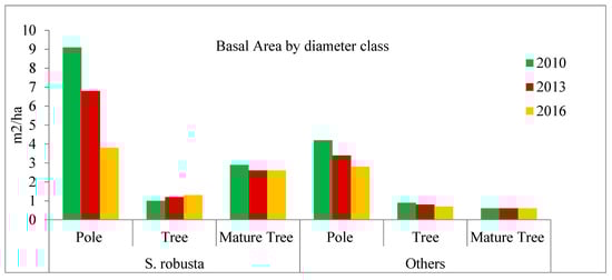 Aside from differences in the frequency and occurrence of tree species (Table 5), the basal area (m2/ha) varied by plots and study sites (Figure 5). The basal area of poles decreased from 9.1 to 3.8 m2/ha for S. robusta and from 4.2 to 2.8 m2/ha for other species. In the case of mature trees, the basal area decreased from 2.9 to 2.6 for S. robusta and remained similar with 0.6 m2/ha for other species.