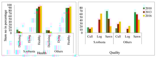 The analysis of the tree health and quality categories (Figure 6) showed that the number of healthy trees increased between 2010 and 2016, i.e., an increment of stems from 85% to 95% of stems per hectare. In the case of declining categories, a decrease has been noticed ranging between 3% to 10% for both forest types (S. robusta and other categories). Similarly, the quality of log and cull trees improved, while that of sawn trees was decreasing for both forest types.