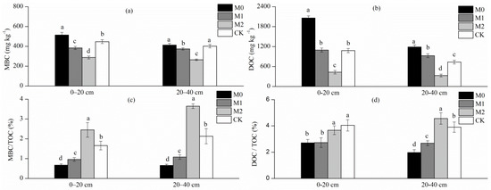 MBC (microbial biomass C) and DOC (dissolved organic C) contents (a,b), and the ratio of MBC to TOC (total organic C) and that of DOC to TOC (c,d) in the soil of the different studied forests.